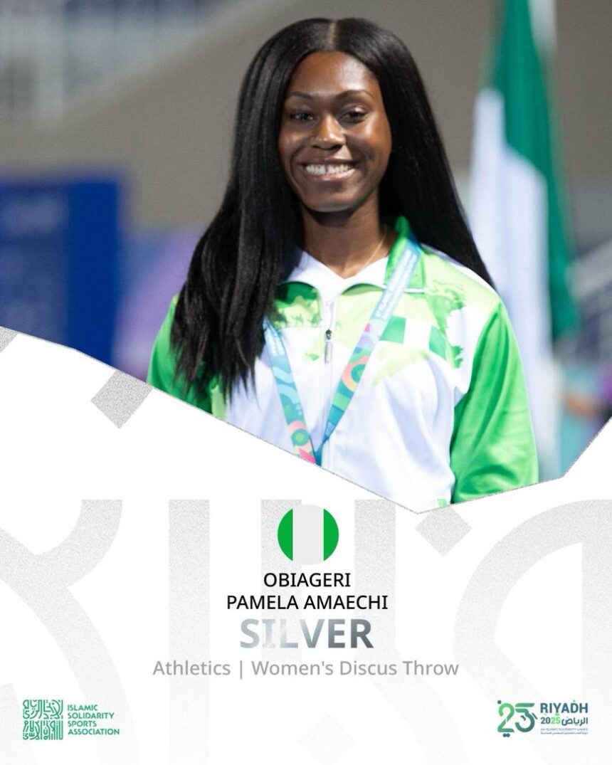 Nigeria’s discus thrower Obiageri Pamela Amaechi won the country’s first medal in Athletics at the ongoing Islamic Solidarity Games in Riyadh, claiming silver in the women’s Discus throw event, www.aclsports.com reports.