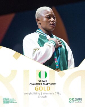 Nigeria’s weightlifter Sarah Ovayioza Matthew won gold in the women’s 77kg Snatch, lifting 116kg, as Nigeria sits sixth on the medal table at the ongoing Islamic Solidarity Games in Riyadh, www.aclsports.com reports.